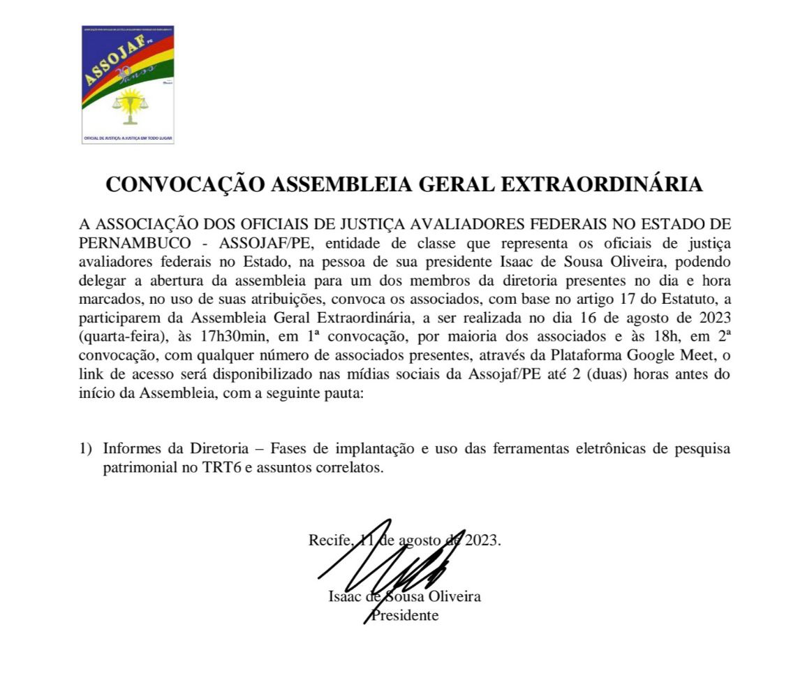 FERRAMENTAS ELETRÔNICAS DE PESQUISA PATRIMONIAL: ASSOJAF-PE REALIZA ASSEMBLEIA EXTRAORDINÁRIA NA PRÓXIMA QUARTA-FEIRA